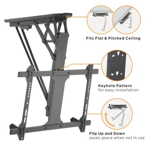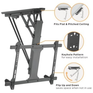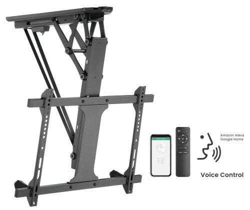 DescriptionExperience the future of home entertainment with smart voice and APP control! LUMI’s PLB-M0546AI Smart Flip Down TV Ceiling Mount is a perfect choice to save space or for room with low ceiling. A quality motor holds TVs up to 32" ~ 70" and lowers and retracts TVs smoothly and quietly. A balanced mechanism prevents any ceiling vibrations when the TV is in motion. There are convenient memory settings as well — a brilliant choice for public or home TV viewing installations!FEATURESPowerful Motor: more stable, strong and durableLeveling adjustments: allow TV to be perfectly positioned after hangingApp Remote Control: remote powered by Tuya AppFlip Down Design: allows for easy storage, cleared up space and out-of-way safetySmart Voice Control: effortlessly adjust the position of the TV with a simple voice command