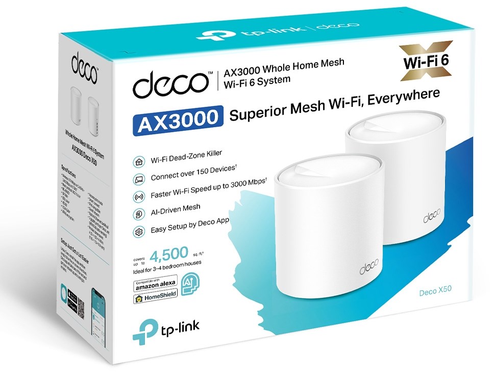 AX3000 Dual Band WiFi – Super-fast WiFi 6 with speeds up to 3.0 Gbps4 Streams, Less Lag – 2×2/HE160 2402 Mbps + 2×2 574 MbpsGigabit Wired Speed – 3× Gigabit ports provide sufficient connectivityBoosted Seamless Coverage – Seamless mesh WiFi coverage up to 4,500 ft2 (2-pack)AI-Driven Mesh – Intelligently learns the network environment to provide ideal WiFi unique to your homeTP-Link HomeShield – Provides comprehensive network protection, robust parental controls, and real-time IoT protectionSetup Made Easier Than Ever – The Deco app walks you through the setup step-by-step