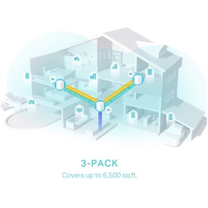 AX3000 Dual Band WiFi – Super-fast WiFi 6 with speeds up to 3.0 Gbps4 Streams, Less Lag – 2×2/HE160 2402 Mbps + 2×2 574 MbpsGigabit Wired Speed – 3× Gigabit ports provide sufficient connectivityBoosted Seamless Coverage – Seamless mesh WiFi coverage up to 6,500 ft2 (3-pack)AI-Driven Mesh – Intelligently learns the network environment to provide ideal WiFi unique to your homeTP-Link HomeShield – Provides comprehensive network protection, robust parental controls, and real-time IoT protectionSetup Made Easier Than Ever – The Deco app walks you through the setup step-by-step
