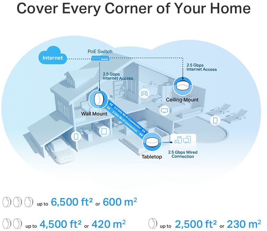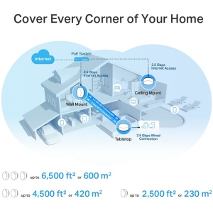 AX3000 Whole Home Mesh WiFi 6 System with PoEAX3000 Dual-Band WiFi – 2402 Mbps (5 GHz) + 574 Mbps (2.4 GHz).Multiple Installation Options – Place it on a tabletop or install it on a ceiling or wall with the adaptive accessories.PoE Supported – Power over Ethernet for simplified network deployment.Multi-Gig 2.5 Gbps Wired Network – 2× 2.5 Gbps ports.Seamless AI-Driven Mesh – Intelligently learns your network environment to provide the ideal WiFi unique to your home.TP-Link HomeShield – Provides comprehensive network protection, robust parental controls, and real-time IoT security.Universal Compatibility – Backward compatible with all WiFi generations and works with any internet service provider (ISP) and modem.Setup Made Easier Than Ever – The Deco app walks you through setup step-by-step.