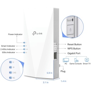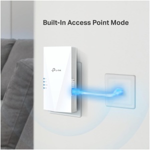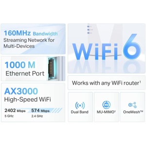 AX3000 Mesh WiFi 6 ExtenderDual Band WiFi 6 – Separates 5 GHz (2402 Mbps) and 2.4 GHz (574 Mbps) WiFi bands for faster speeds and greater capacity with the latest technologyUninterrupted Streaming – Easily create a TP-Link OneMesh™ network for seamless whole home WiFi coverageAP Mode – Create a new WiFi access point through the Gigabit Ethernet portto enhance your wired network with WiFi capabilityAdaptive Path Selection – Automatically choosing the fastest connection path to the routerApp Control -Easy Setup and management with your network using the TP-Link Tether app