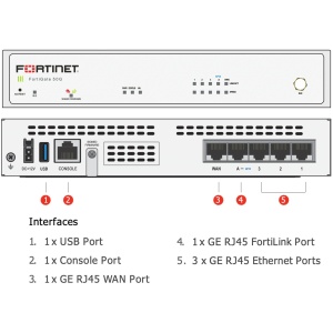 The Fortinet FortiGate 50G series is a compact, high-performance next-generation firewall (NGFW) designed for small to medium-sized businesses, branch offices, and distributed enterprise sites. It integrates advanced security features, SD-WAN capabilities, and wireless connectivity options into a single appliance, making it ideal for building secure networks and transforming WAN architectures.Key FeaturesHigh-Performance Security: Powered by Fortinet’s proprietary SP5 ASIC, the FortiGate 50G delivers up to 5.0 Gbps firewall throughput, 2.3 Gbps IPS throughput, and 4.5 Gbps IPsec VPN throughput. Comprehensive Threat Protection: Includes intrusion prevention system (IPS), anti-malware, application control, SSL inspection, and DDoS protection.Zero Trust Network Access (ZTNA): Supports ZTNA to ensure secure and granular access control. Integrated SD-WAN: Built-in SD-WAN capabilities enable efficient and secure WAN management. Wireless Connectivity Options: Models like the FortiWiFi 50G offer built-in Wi-Fi 6 (802.11ax) access points, while others support embedded 5G, DSL, or SFP modules for versatile connectivity. Trusted Platform Module (TPM): Enhances hardware-based security by securely storing cryptographic keys. Compact and Reliable Design: Desktop form factor suitable for small environments, with options for wall mounting.SpecificationsFeatureSpecificationFirewall ThroughputUp to 5.0 GbpsIPS Throughput2.3 GbpsThreat Protection1.1 GbpsIPsec VPN Throughput4.5 GbpsConcurrent SessionsUp to 720,000New Sessions per Second85,000Max Firewall Policies2,000Max VPN Tunnels200 (IPsec)Max Access Points16 (for WiFi models)Form FactorDesktop (216 x 160 x 40.5 mm)Weight1.00 kgPower SupplyExternal PSUInterfaces (Model-Dependent)Port TypeQuantityGE RJ45 PortsUp to 5 (including WAN and LAN)GE SFP Port1 (on SFP models)PoE+ PortsUp to 3 (on SFP-PoE models)USB Port1Console Port1DSL Module1 (on DSL models)5G ModuleEmbedded with 5 external antennas (on 5G models)Model VariantsFortiGate 50G: Base model with standard interfaces.FortiGate 50G-SFP: Includes an additional SFP port for fiber connectivity.FortiGate 50G-SFP-POE: Adds PoE+ capabilities for powering devices like IP phones and cameras.FortiGate 50G-DSL: Features an embedded DSL modem for broadband connections.FortiGate 50G-5G: Equipped with an embedded 5G module and external antennas for high-speed wireless WAN.FortiWiFi 50G: Integrates Wi-Fi 6 access point for wireless connectivity.