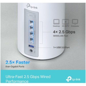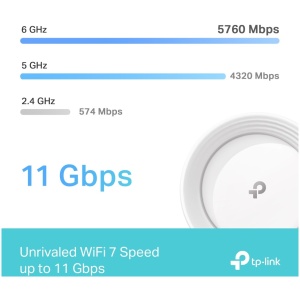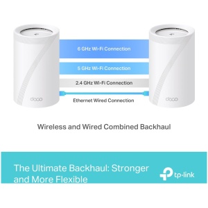 9214 Mbps Tri-Band WiFi – 5760 Mbps (6 GHz) + 2880 Mbps (5 GHz) + 574 Mbps (2.4 GHz).2.5 Gbps Wired Connections – 4× 2.5 Gbps ports ensure max flexibility and boosted throughput.Wireless and Wired Combined Backhaul – Connects a wireless and wired backhaul with each unit simultaneously to improve overall throughput and reduce latency.Multi-Link Operation (MLO) – Simultaneously send and receive data across different bands and channels to increase throughput, reduce latency, and improve reliability.320 MHz Channels – Double the bandwidth and enables many more simultaneous transmissions at the fastest possible speeds.Works on the 6 GHz Band – Minimizes congestion with greenfield spectrum, delivering robust high-speed connections.TP-Link HomeShield – Provides comprehensive network protection, robust parental controls, and real-time IoT security.Universal Compatibility – Backward compatible with all WiFi generations and works with any internet service provider (ISP) and modem.
