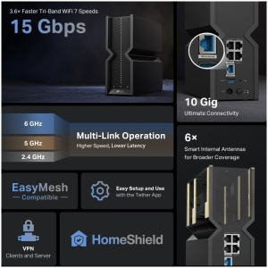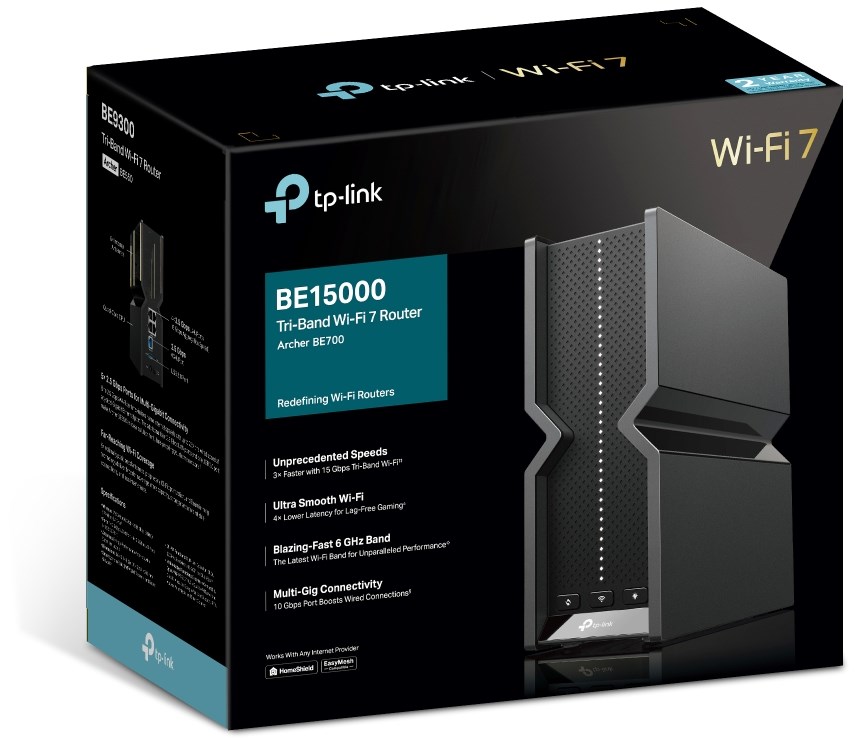 BE15000 Tri-Band Wi-Fi 7 RouterBlazing-Fast 15 Gbps Tri-Band Wi-Fi: Wi-Fi 7 unleashes the full potential of the 6 GHz band with up to 320 MHz channels and 11.5 Gbps Wi-Fi speeds. Enjoy full access to 8K streaming and high-speed downloading.3× Faster than Wi-Fi 6E: Multi-Link Operation (MLO) enables Archer BE700 to transmit data with Wi-Fi 7 clients across the 6 GHz, 5 GHz and 2.4 GHz bands simultaneously, delivering 3× faster Wi-Fi speeds than Wi-Fi 6/6E routers.4× Latency with Minimal Buffering: Significantly lower latency than Wi-Fi 6/6E routers enables emerging applications like VR/AR, video conferencing, and online gaming to always run at top performance.Higher Capacity for More Devices: Communicates with multiple devices via 8 streams and tri-band simultaneously. Combined with the powerful CPU, Wi-Fi 7 provides congestion-free signals to your laptop, TV, thermostat, and baby monitor.EasyMesh-Compatible: Works with EasyMesh routers and range extenders to form seamless whole home Mesh WiFi, preventing drops and lag when moving between signals.TP-Link HomeShield: Enhanced security defends against the latest cyber threats.