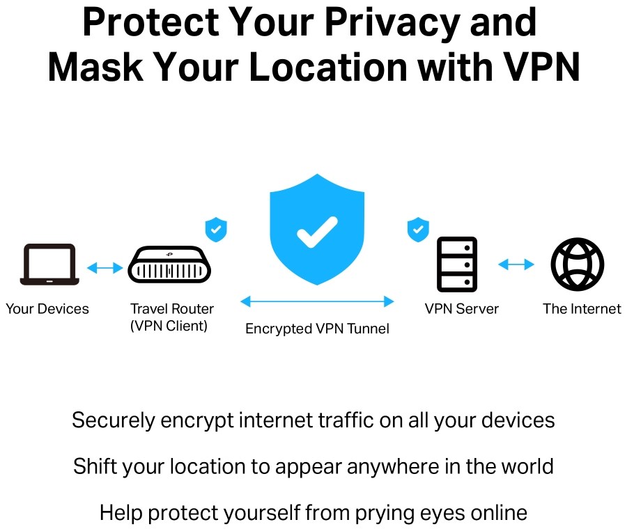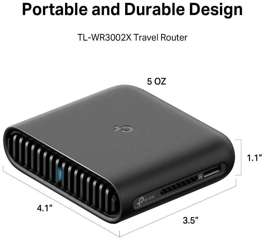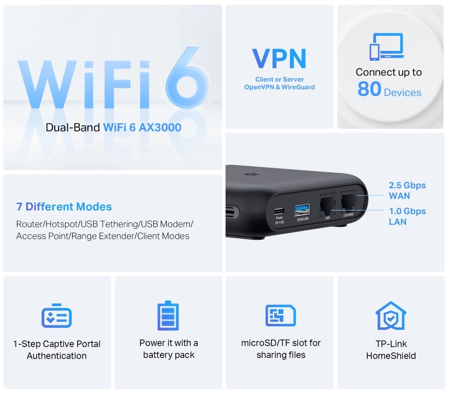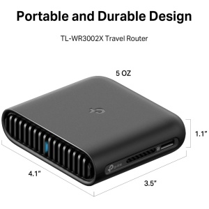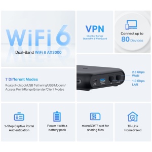 AX3000 Dual-Band Wi-Fi 6 Travel Router: Merging Wi-Fi 6 Technology, TL-WR3002X delivers fast wireless speed (2402 Mbps on 5 GHz, 574 Mbps on 2.4 GHz) for uninterrupted video streaming, downloading, and online gaming all at the same time.2.5G Multi-Gig Connectivity: 1× 2.5 Gbps WAN port + 1× Gigabit LAN port offer high-speed data transmissions.Portable and Durable Design: TL-WR3002X is a pocket-sized travel router compactly designed for your next trip or adventure. Its small size is designed for travel-friendly storage. Enjoy Reliable Network Anywhere: Supporting multiple modes (Router / USB Tethering / 3G-4G USB Modem / Hotspot / Access Point / Range Extender / Client), TL-WR3002X allows you to create Wi-Fi in various scenarios at home, hotel rooms or on the road.Easily Access Your Files From Anywhere: By plugging an external USB hard disc or a TF card into the router, you can easily share files between connected devices.24/7 Secure Surfing with VPN Encryption: Supporting OpenVPN and WireGuard®, TL-WR3002X can keep your network private and secure from anywhere in the world, whether you‘re working remotely abroad, or browsing on the public WiFi.Power It with a Power Bank: With a Type-C interface, you can flexibly turn it into a mobile router with a power bank.