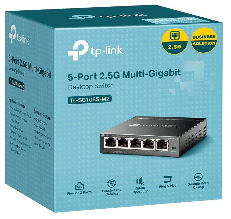 5-Port 2.5G Multi-Gigabit Desktop SwitchFive 2.5 Gbps Ports. 5× 2.5-Gigabit ports unlock the highest performance of your Multi-Gig bandwidth and devices, and provide up to 25 Gbps of switching capacity.Super-Fast Connections. Provides super-fast connections to 2.5G NAS, 2.5G Server, gaming computer, 2.5G WiFi 6 AP, 4K video, and more.Ideal for Various Scenarios. Built for LAN parties, home entertainment, small and home offices, and instant transfer for workstations,Hassle-Free Cabling. Instantly upgrade to 2.5 Gbps without the need to upgrade to Cat6 wiring, reducing wiring costs and hassle.*Silent Operation. Industry-leading fanless design ensures silent operation, ideal for any home or business.Plug and Play. Allows for easy deployment without the need for a technician.Metal Casing. Durable metal casing and desktop/wall-mounting design are well-suited for different environments.