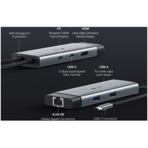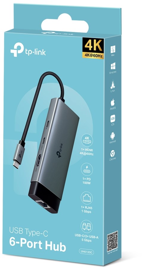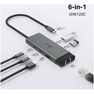USB Type-C 6-in-1 Hub6-in-1 USB-C Hub: UH6120C turns a single USB-C port into 6 ports with a 4K@60Hz HDMI, 1 Gbps ethernet, 100W Power Delivery, 1× USB-C Data Ports, 2× USB-A Data Ports.Ultra High-Definition Media Display: Connect to an external monitor via the 4K@60Hz HDMI port for a stunning ultra high-definition experience.Stable Gigabit Connection: This compact gadget provides stable Gigabit Ethernet connectivity for your ultrabook, Chromebook, laptop, or desktop.Powerful 100W Fast Charging: Plug the charging cable into UH6120C and continuously deliver up to 100W of power to your PC while transferring files or streaming media.5 Gbps SuperSpeed Data Transfer: UH6120C adds three USB 3.0 ports to your device, enabling simultaneous use of multiple USB devices.Easy to Use with Plug & Play: Simply plug in and start using in seconds, thanks to driver-free install with Mac OS X El Capitan Version 10.11.6 and later, Windows 11/10/8.1, Linux OS, iPad OS, iOS, Android, and Chrome OS.