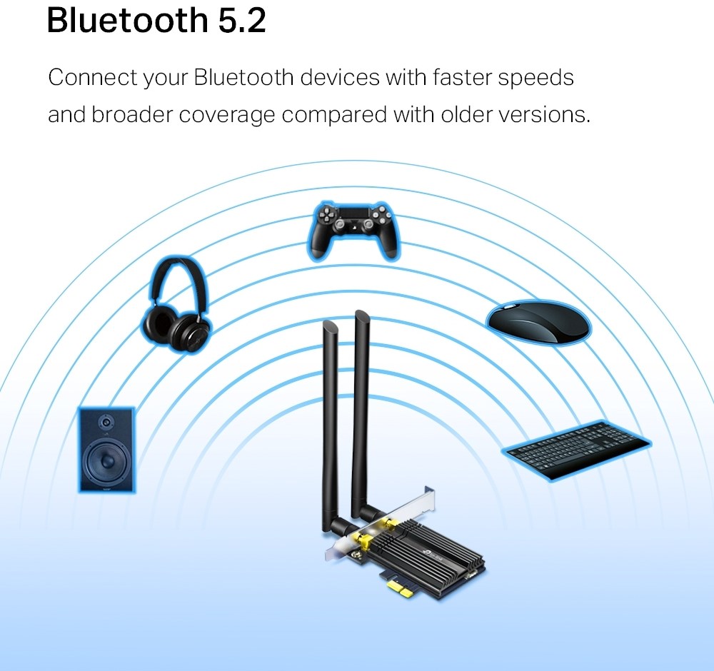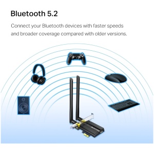 AX3000 Wi-Fi 6 Speeds: Reach incredible speeds up to 2.4 Gbps (2402 Mbps on 5 GHz or 574 Mbps on 2 4 GHz), ultra-low latency and uninterrupted connectivity using Wi-Fi 6 technology such as 1024-QAM and 160 MHz bandwidth.Minimized Lag for Your PC: Revolutionary OFDMA and MU-MIMO technology reduces lag so you can enjoy ultra-responsive real-time gaming or an immersive VR experience on even the busiest of networks. Broader Range: Two powerful signal-boost high-gain antennas greatly increase range for a smoother online experience further away.Bluetooth 5.0 for Greater Speeds and Range: Archer TX50E achieves 2x faster speeds and 4x broader range so you can connect your favorite devices such as game controllers, headphones, and keyboards for the ultimate setup.Cutting-Edge WPA3: Protect your network with the latest WPA3 security protocol so your information is secure from hackers.Premium quality & Performance: Gold plating and a customized heat sink improve connection stability and efficiency ensuring ultimate performance.Support Compatibility: Supports Windows 11/10 (64bit) only – Driver installation required via Website or included CD.