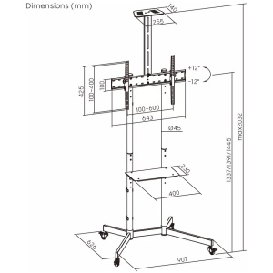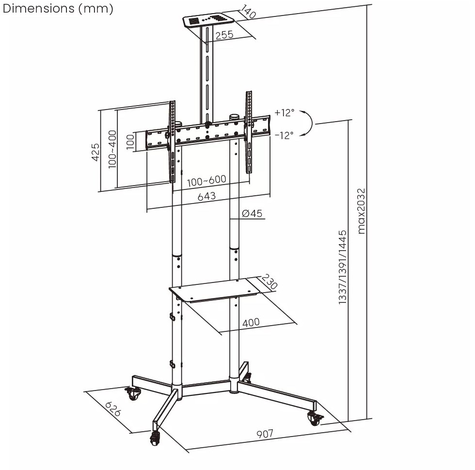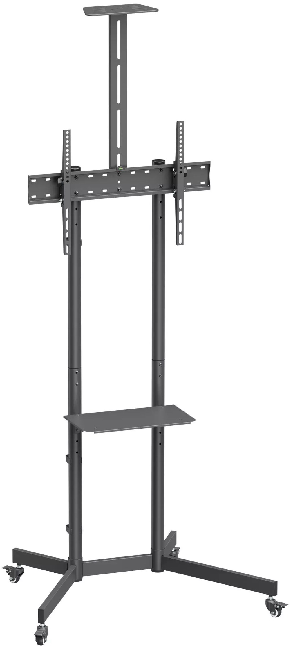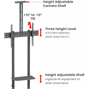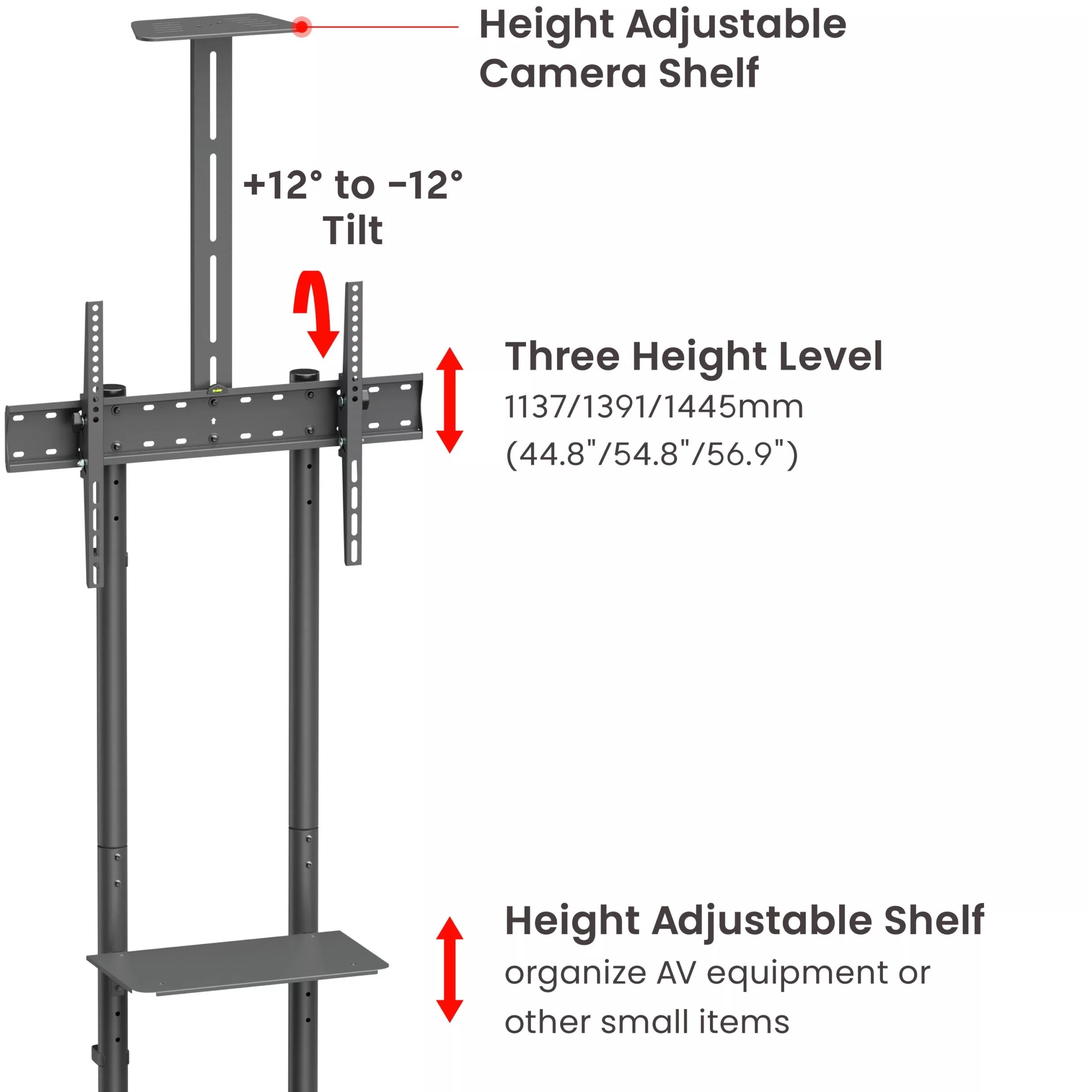 DescriptionType: High Quality TV Cart with shelf & castersColor: BlackMax screen Size: 37” – 80”Overview:Mobile cart for screen displayHeight adjustable TV mountHeight adjustable equipment shelf4 heavy-duty casters with locking brakeCable clip – organizer cable routesProduct Specification:Tilt Range: +12°~-12°Load capacity: up to 45kgDistance to Wall Range: 700~1500mmMaterial: SteelVesa: 100×100, 200×200, 300×200, 400×200, 300×300, 400×300, 400×400, 600×400