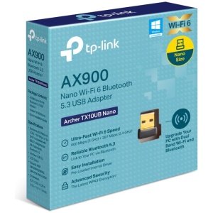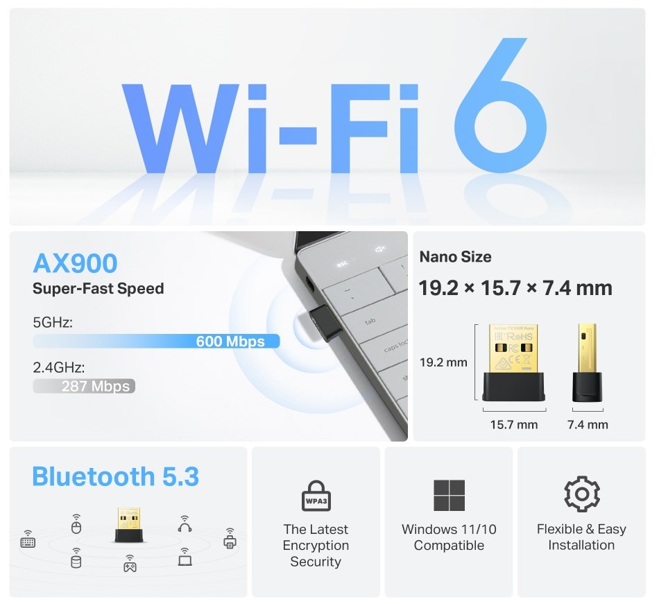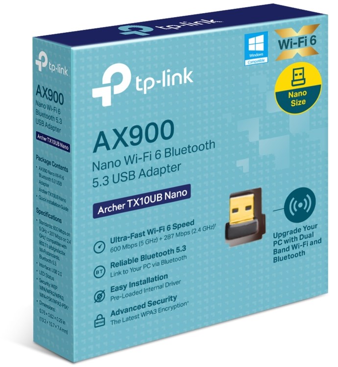 AX900 Nano Wi-Fi 6 Bluetooth 5.3 USB AdapterHigh Speed WiFi – Up to 900 Mbps speeds with 287 Mbps on 2.4 GHz and 600 Mbps on 5 GHz, upgrades your devices to higher AX WiFi speeds.Dual Band Wireless – 2.4GHz and 5GHz band for flexible connectivity, upgrades your devices to work with the latest dual-band WiFi router for faster speed and extended range.Reliable Bluetooth 5.3 – Bluetooth 5.3 has been enhanced in terms of reliability and security, which ensures a more robust coordination with your game controllers, headphones, keyboards an etc.Nano design – Small, unobtrusive design allows you to plug it in and forget it is even thereOperating System – Supports Windows 11/10Advanced Security – Supports WEP, WPA/WPA2/WPA3, WPA-PSK/WPA2-PSK, WPA3-SAE encryption standards